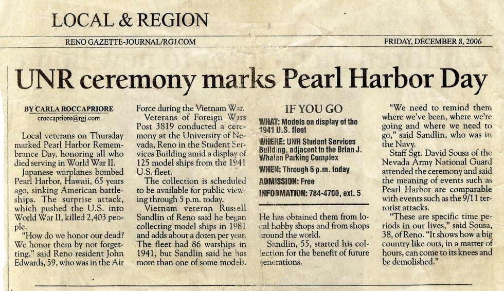 December 7th 2006--University of Nevada RenoOfficial ceremony at the University of Nevada Reno. Members of Veterans of Foreign Wars Post #3819 tolled ship’s bell in remembrance of the men and ships lost on the 65th anniversary of the attack on Pearl Harbor. The exhibit of the US Fleet 1941 Recreation Project was held for two days. Joe Hart, anchorman, for channel 4 NBC reported the story on local news broadcast, before the NBC national broadcast of the Remembrance Ceremony at the Pearl Harbor Visitors Center in Hawaii. Brian Williams anchored the news broadcast, and Tom Brocaw covered the ceremony. The Reno Gazette Journal newspaper covered the local event in Reno, Nevada.