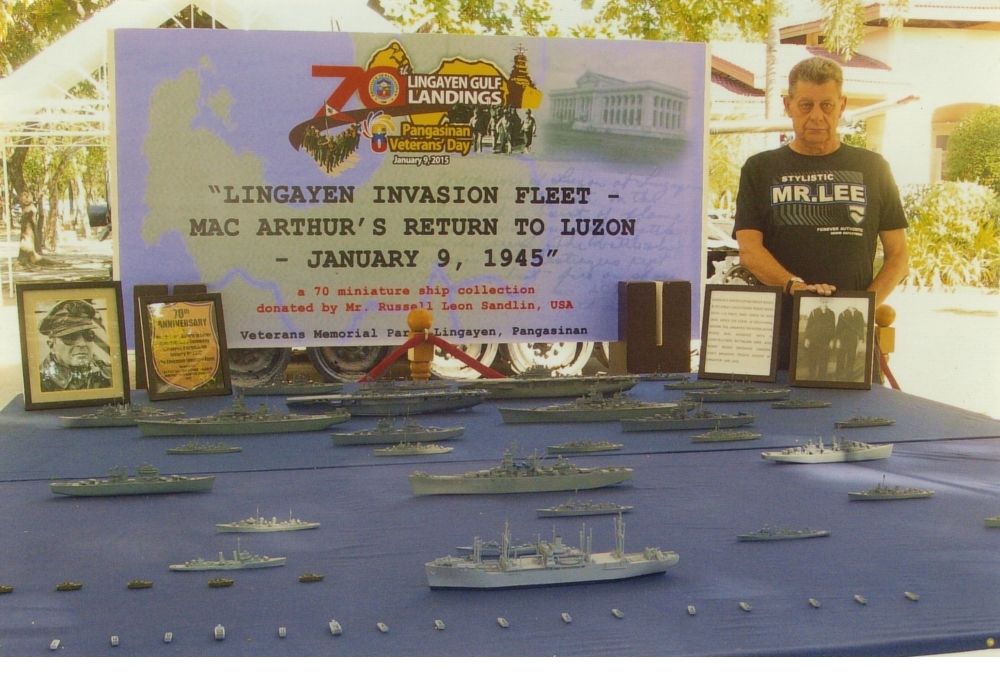 70th Anniversary Commemoration of MacArthur's return to Luzon at Lingayen, Province of Pangasinan, Philippines. The event took place at MacArthur's Memorial Park with a Ceremony and Banquet. Honored the memory of Russell Sandlin's grandfather "Oscar Rogez", and Oscar's brother, great uncle "Henry Rogez", who participated in that invasion on January 9th 1945. As part of the ceremony, 70 ship models were oficially donated, exhibited on October 20th 2014 at Magellan's Museum, to the MacArthur's Memorial Park. The Governor of Pangasinan received the donation and presented Mr. Sandlin with a letter of acceptance. A copy of the DVD "Victory at Sea, Return to the Philippines" was presented . The video was shown on Big Screen to all attending the Banquet. The story was covered by ABS-CBN Channel 2, GMA 7, as well as the Manila Bulletin and the Philippine Daily Inquirer newspapers.